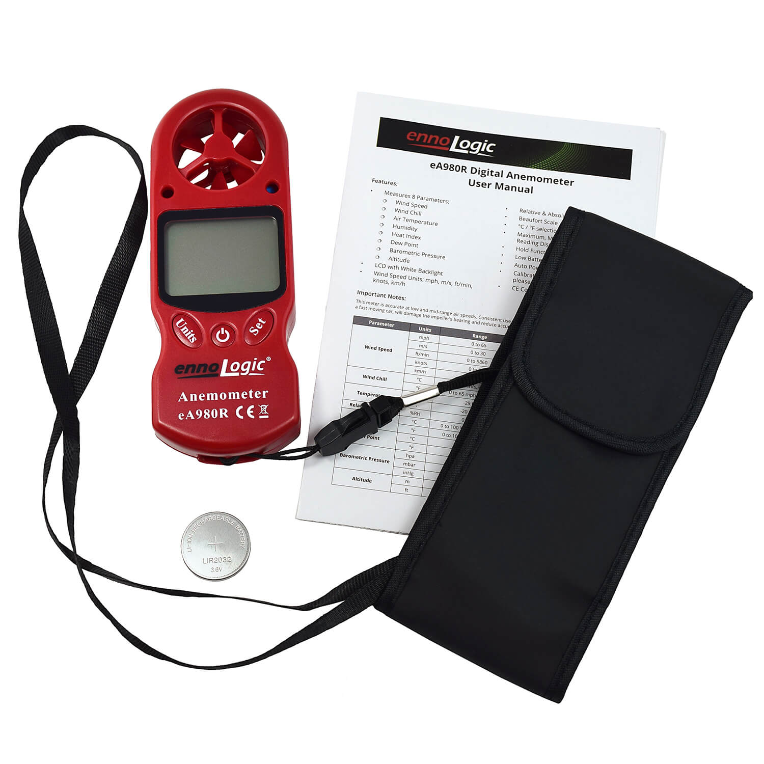 But the ennoLogic anemometer eA980R measures more than just wind speed. It also registers wind chill, air temperature, humidity, heat index, dew point, barometric pressure, and pressure altitude. With all that it’s hard to believe that this little weather station is smaller than a cell phone and easily fits into your pocket.