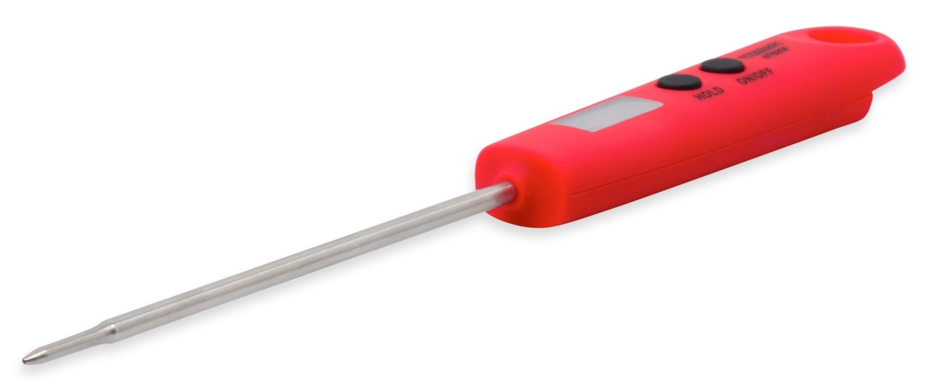 The extra long probe with its slender tip keeps this thermometer from putting your hands in too-close contact with hot foods and keeps the probe from punching big holes in foods and causing meat juices to drain out of your delicious steaks and roasts.